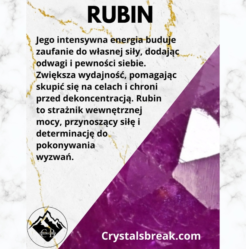 Rubin, kamień o głębokiej, namiętnej barwie, jest potężnym sprzymierzeńcem w walce z melancholią i smutkiem. Jego intensywna energia pomaga zbudować zaufanie we własną siłę i potencjał, dodając odwagi i pewności siebie. Rubin zwiększa wydajność, pomagając skupić się na celach i zadaniach, a także chroni przed zbiciem z tropu. Ten wyjątkowy kamień to prawdziwy strażnik wewnętrznej mocy, przynoszący siłę i determinację potrzebne do pokonywania życiowych wyzwań.Przygotowanie naszych rękodzieł do wysyłki zazwyczaj zajmuje od 1 do 2 dni roboczych. Jeśli wystąpi jakiekolwiek opóźnienie, zawsze staramy się poinformować Klienta drogą telefoniczną lub mailową. Czas dostawy zależy od wybranej formy dostawy i wynosi zazwyczaj od 1 do 4 dni roboczych na terenie Polski. Dostawy międzynarodowe mogą trwać dłużej, w zależności od kraju docelowego.