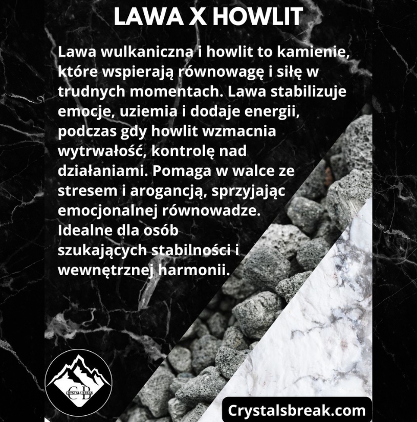 Lawa wulkaniczna i howlit to kamienie, które wspierają równowagę i siłę w trudnych momentach. Lawa stabilizuje emocje, uziemia i dodaje energii, podczas gdy howlit wzmacnia wytrwałość, kontrolę nad działaniami. Pomaga w walce ze stresem i arogancją, sprzyjając emocjonalnej równowadze. Idealne dla osób szukających stabilności i wewnętrznej harmonii.