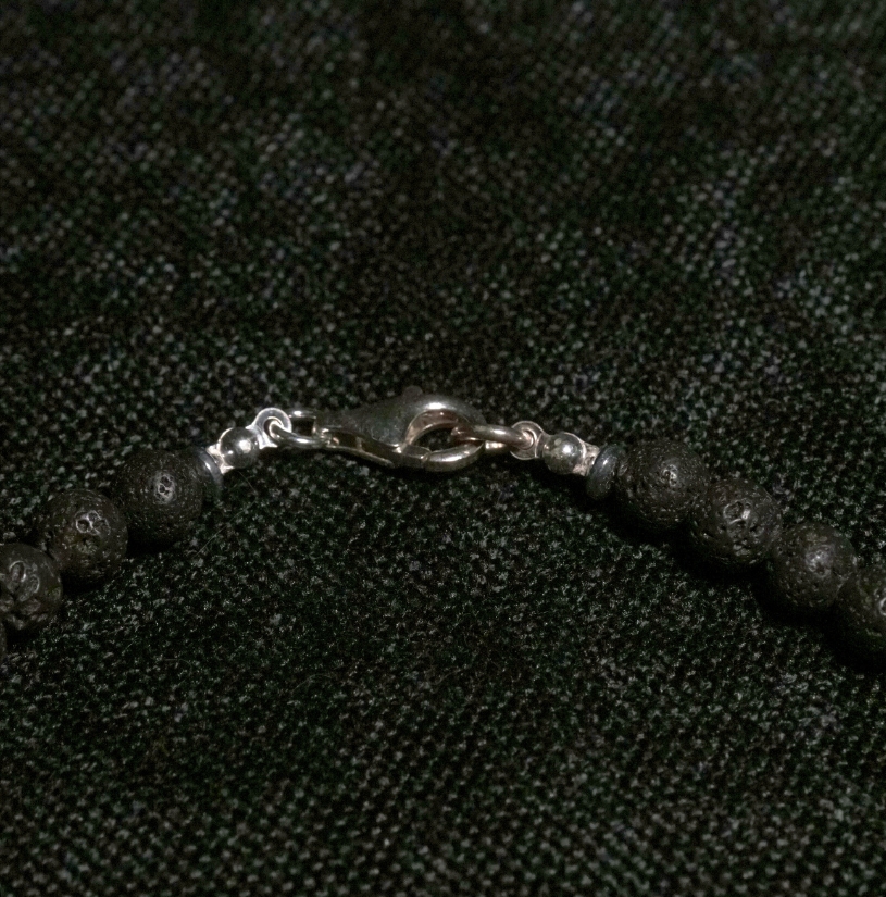 Użyto: Lawa oraz howlit, przekładki srebrny hematyt, zapięcie srebro próby 925.